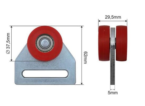 Wózki firanki naczepy montowane na pasy lub śruby. Wózek jezdny kurtyny bocznej naczepy montowany w prowadnicy firanki naczepy. Stosowany w naczepach kurtynowych. Stalowy płaskownik z otworami na pas lub śruby, rolki stalowe lub tworzywowe, obustronne lub jednostronne.
