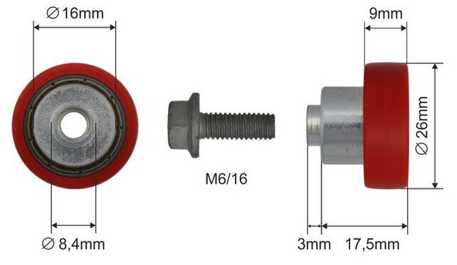 Łożysko dachu składanego typ Versus (czerwone łączniki pomiędzy poprzeczkami dachu). Rolka o średnicy 26 mm, część robocza czerwona tworzywo sztuczne. Mocowanie gwint śruby, łożysko kulkowe.