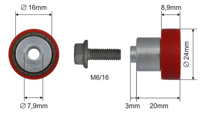Łożysko dachu składanego marki Versus (czerwone łączniki pomiędzy poprzeczkami dachu). Rolka o średnicy 24 mm, część robocza czerwona tworzywo sztuczne. Mocowanie gwint śruby, łożysko kulkowe. Jest to cześć zamienna do wózka dachu suwanego marki Versus.