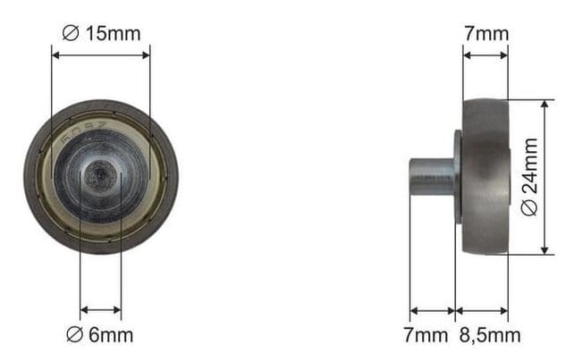Łożysko dachu składanego stalowe o średnicy 24 mm. Łożysko kulkowe ze sworzniem nitowanym. Sworzeń fi 6 mm.