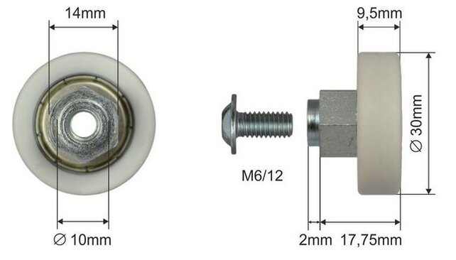 Średnica rolki to 30 mm, łożysko stalowe kulkowe, wewnętrzny gwint M6, koło zewnętrzne tworzywo sztuczne polioksymetylen.