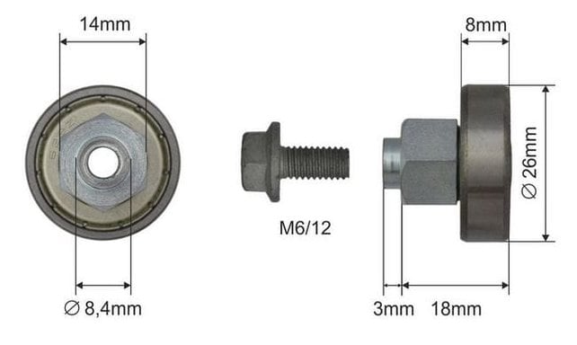 Rolka do wózka dachu naczepy, fi 26 mm. Stalowa rolka dachu suwanego, składanego. Łożysko dachowe stosowane m.in. w naczepach Schmitz z dachem TSE. Łożysko dachu składanego kulkowe ze sworzniem gwintowanym.