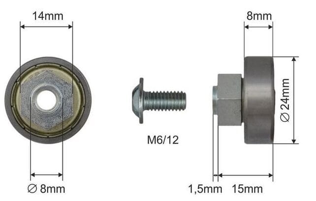 Stalowa rolka dachu suwanego, składanego. Rolka posiada stalowe łożyska kulowe chromowane wraz z kołem stalowym