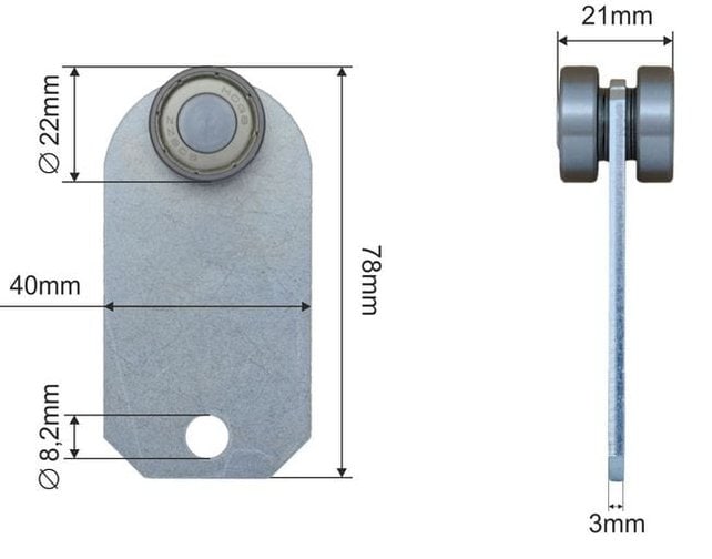 Stalowy wózek na płaskowniku, rolka stalowa fi 22 mm, podwójna.